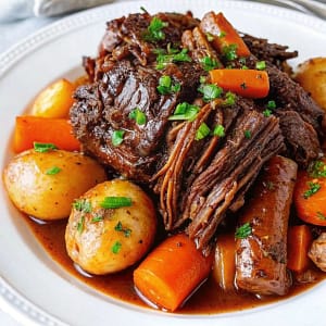 A hearty, comforting slow cooker pot roast made with tender beef, carrots, and potatoes simmered in rich gravy. Set it in the morning and come home to a perfectly cooked, melt-in-your-mouth dinner the whole family will love.